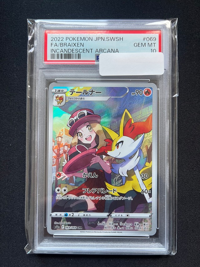 【商品名】 PSA10 テールナー CHR (Incandescent Arcana / 白熱のアルカナ) 069/068 【状態】 PSA鑑定にて GEM MT 10 を取得した個体です。 鑑定ケースも目立つ傷なく綺麗な状態です。 カードの状態は写真にてご確認ください。 【商品詳細】 ・シリーズ:白熱のアルカナ ・レアリティ:CHR ・鑑定:PSA10(GEM MT) ・番号:069/068 ・鑑定ケースのまま発送いたします。 【発送について】 防水・衝撃対策をして丁寧に梱包の上、匿名配送にてお送りします。 【注意事項】 すり替え防止のため、返品・交換はお受けできません。 PSA評価以上の状態は保証できませんのでご了承ください。